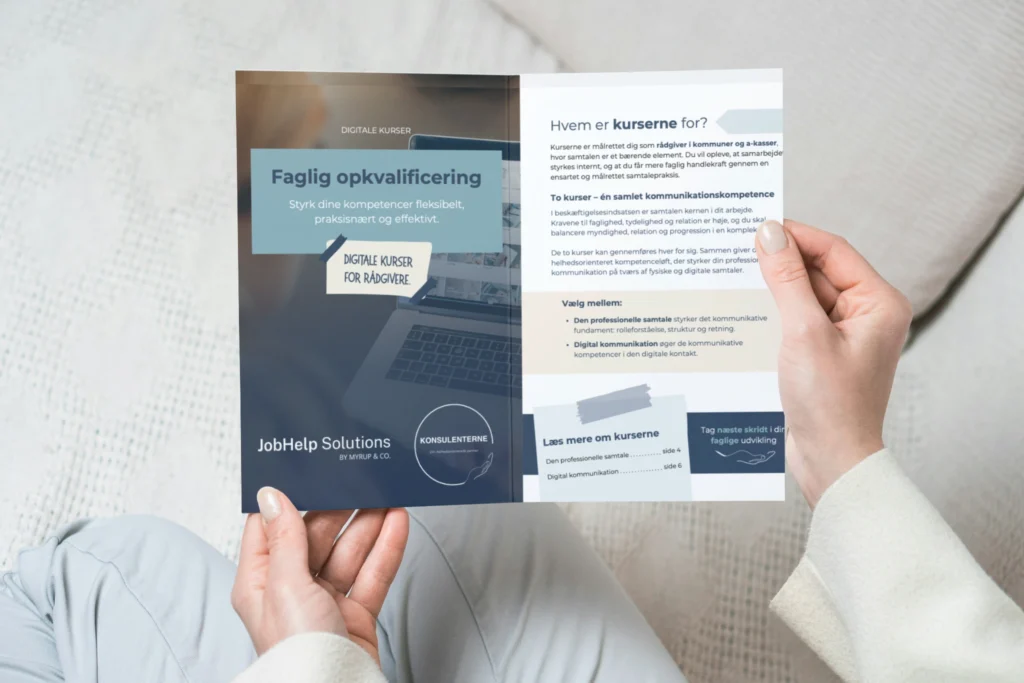 Samtalen er et af de vigtigste styrings- og samarbejdsredskaber i arbejdet med borgerne. Kurserne giver rådgiver værktøjer, der hjælper med at skabe retning, styrker den enkeltes motivation og understøtter progression – både i fysisk og digital kontakt.